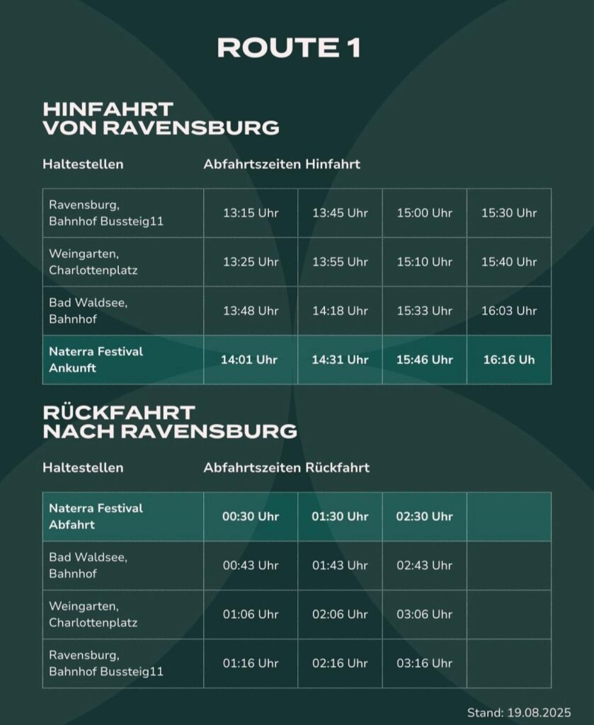 • Ravensburg Hbf → Weingarten (Charlottenplatz) → Bad Waldsee → Naterra Festival